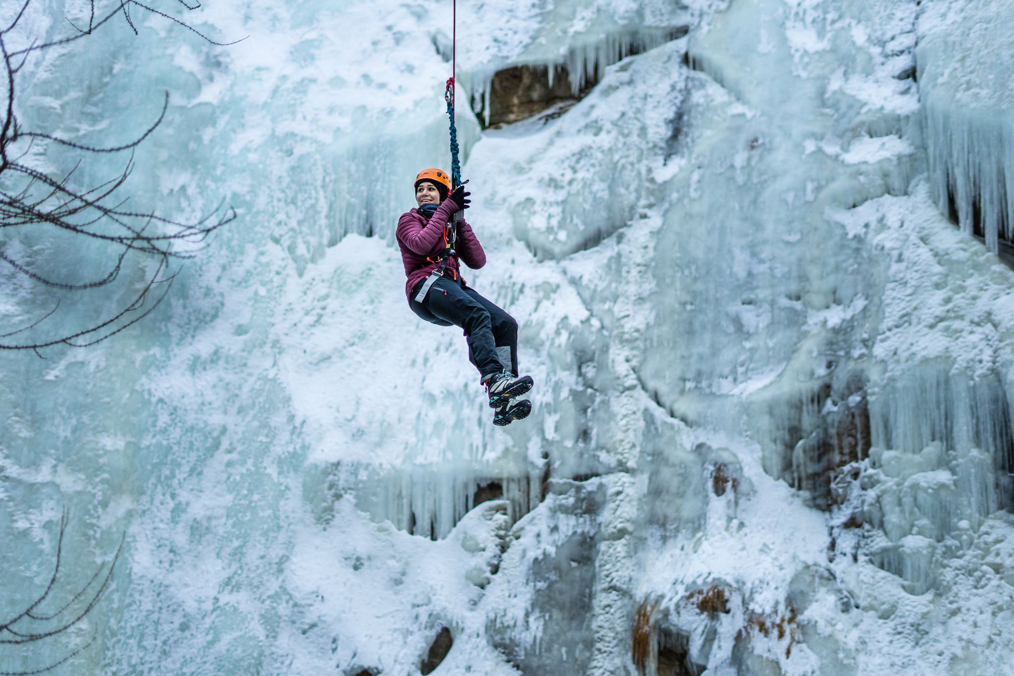 Fast routiniert absolvieren wir mit der nächsten Seilrutsche eine nach der anderen die zweite Schluchtüberquerung. Wir wissen jetzt, dass wir im Schritttempo rübergleiten und fest in der Sicherung hängen – aber dafür genug Zeit haben, die spektakuläre Umgebung zu betrachten. Dicke Eiszapfen hängen von den Wänden, massives Gestein ragt in die Höhe und in die Tiefe.