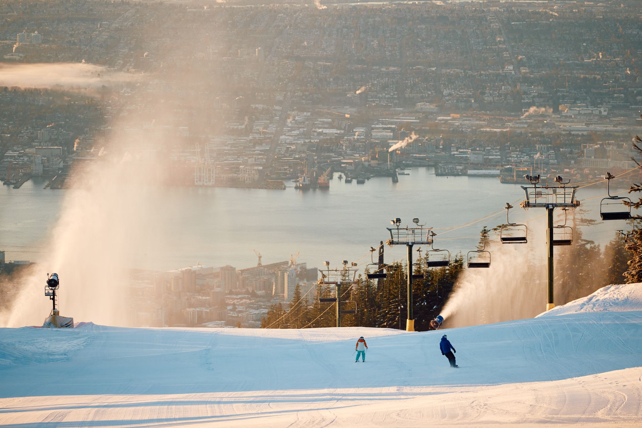 «Ist das nicht einzigartig?», fragt Luisa Staudt, als die Dämmerung über den Grouse Mountain hereinbricht. 1.231 Meter hoch über Vancouver steht die junge Skilehrerin aus Deutschland an der Bergstation des Peak-Sessellifts und zeigt hinunter ins Tal. Der Blick schweift über verschneite Pisten und weiß gezuckerte Tannen. Unten glitzern die Wellen des Burrard Fjords im Abendlicht, dahinter leuchtet Vancouvers Hochhaus-Skyline, die sich markant vor den umliegenden Bergen abzeichnet.